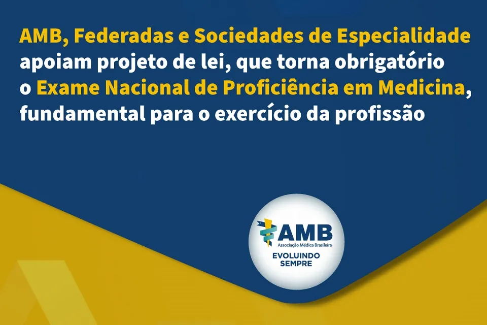 A Associação Médica Brasileira (AMB), 20 Federadas e 40 Sociedades de Especialidades Médicas manifestaram, na tarde desta quinta-feira (5), apoio total ao Projeto de Lei que estabelece obrigatoriedade do Exame Nacional de Proficiência em Medicina como requisito fundamental para o exercício da profissão médica – Projeto de Lei nº 2.294, de 2024. Leia mais.