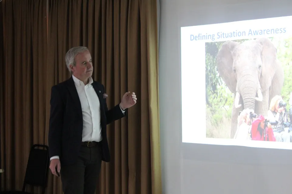 O especialista demonstrou um exemplo prático para falar sobre a percepção da situação. Para isso, utilizou a foto de um grupo de turistas com câmeras fotográficas em um safari olhando para frente, enquanto um elefante vinha atrás deles, sem que percebessem a presença do animal – o que, para ele, simboliza um conhecimento nulo da situação. Ele questionou como aquele grupo não percebeu o perigo iminente.